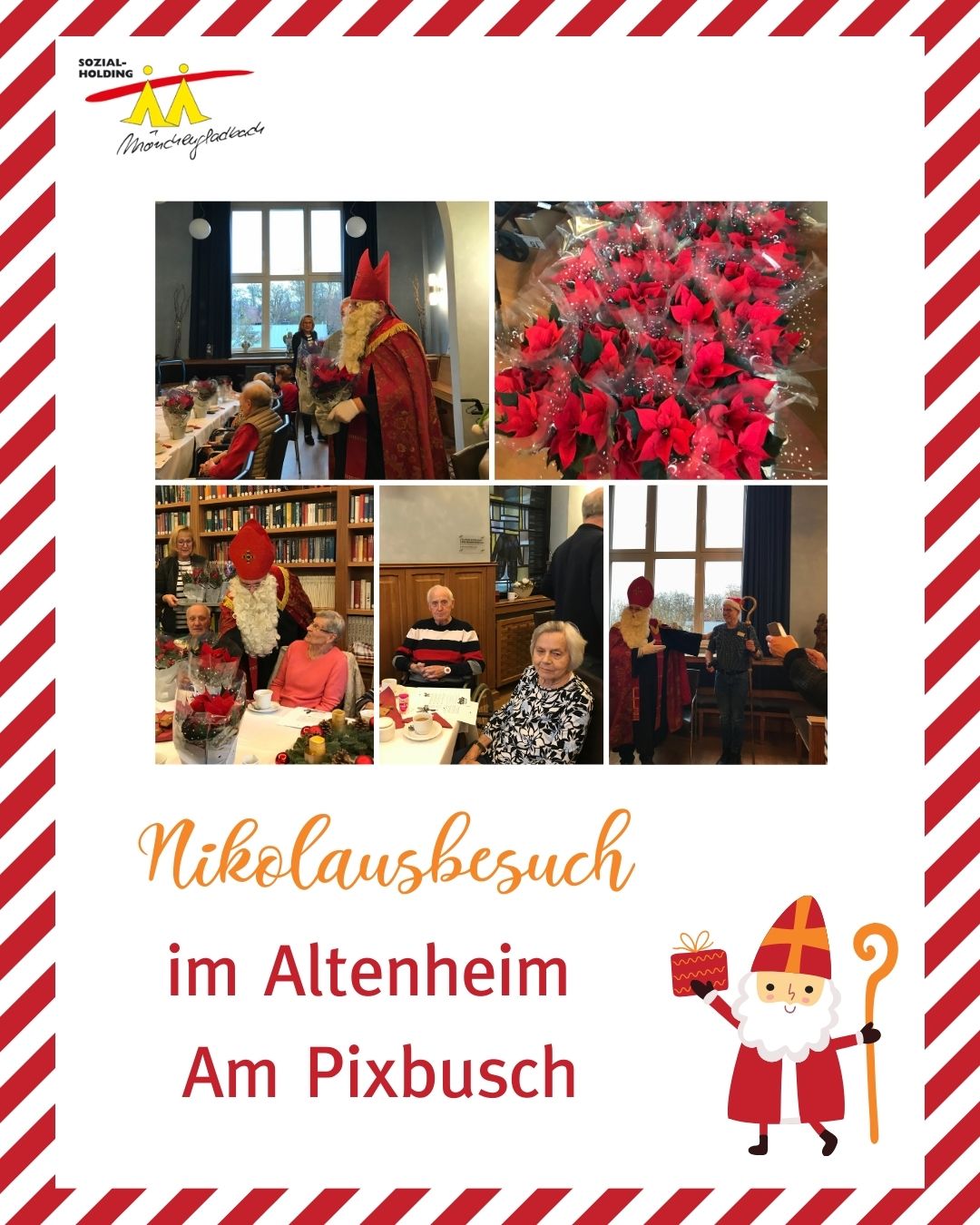 Für unsere Bewohnerinnen und Bewohner hatte er kleine Weihnachtssterne dabei, die Freude war riesig. Gemeinsam wurde gesungen, gelacht und sich an frühere Nikolaustage erinnert.